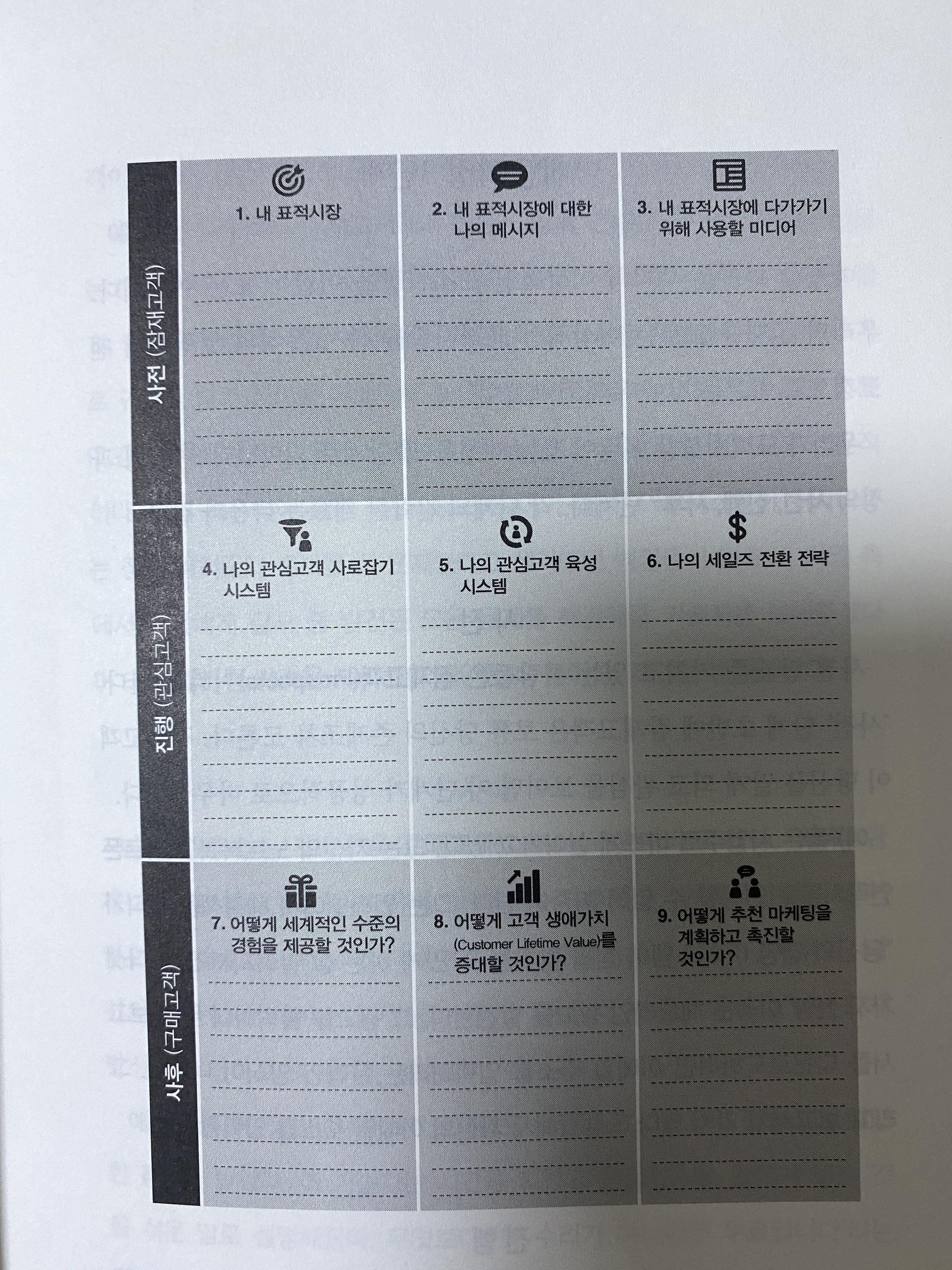 한장으로 소개하는 마케팅 플랜은 책을 읽으면서 메모 형태로 채워가는 방식으로 소개해준다.